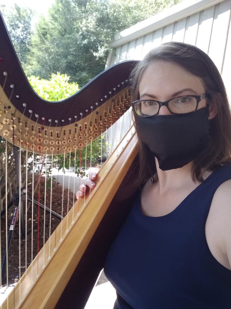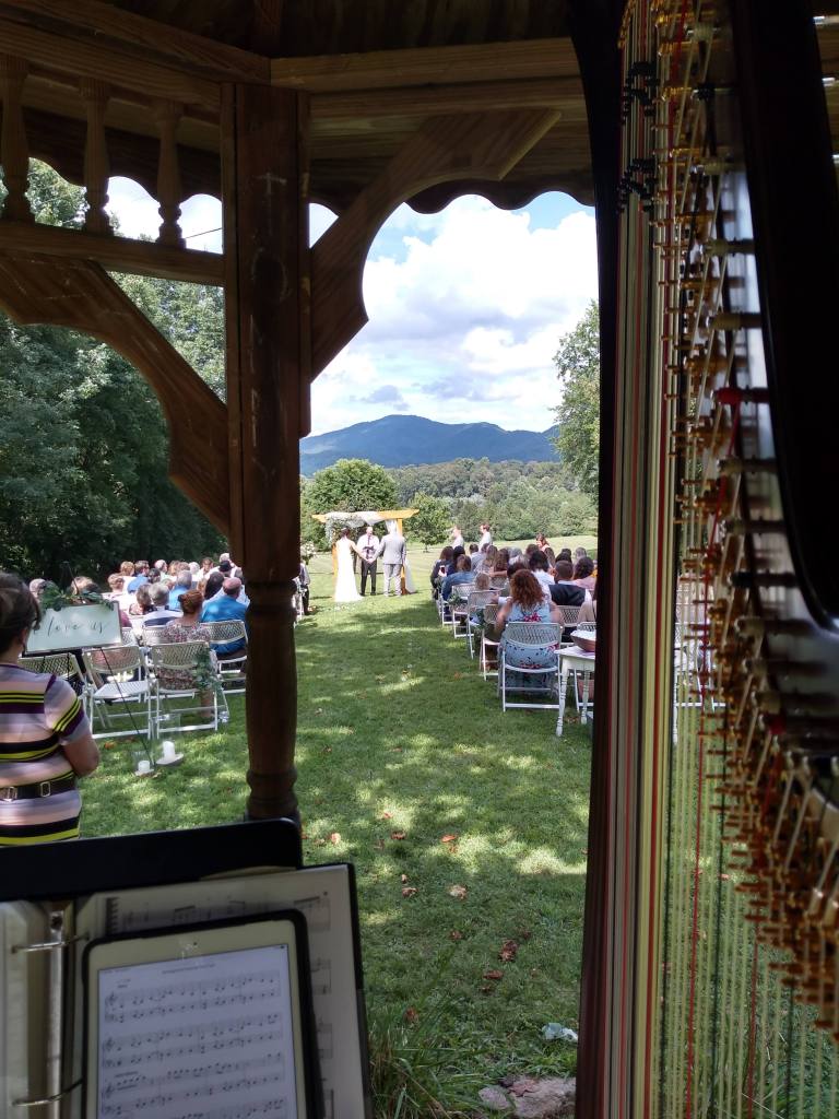 A Couple of weeks later, I found myself at the Lodge at Cat Creek in Franklin, NC (https://lodgeatcatcreek.com). I set up in a little gazebo, but needed a little help. There were some big stepping stones that had to be moved because, well, harps can’t step. I have a cart, so it can roll, but it often high centers on things like rocks. Anyway, I got a few guys to dig the rocks out and help lift the harp into place. I think men in suits try even harder to prove their usefulness.